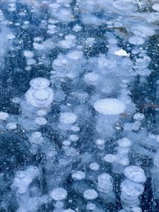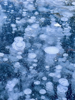 冬の湖、水中で湧いたガスの気泡が、湖面に浮き上がってくる前に凍結する現象です。