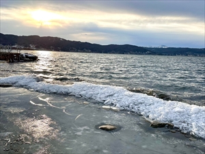 湖面に張った氷が割れ、風や波で岸に積み上がる、こちらも冬ならではの現象です。