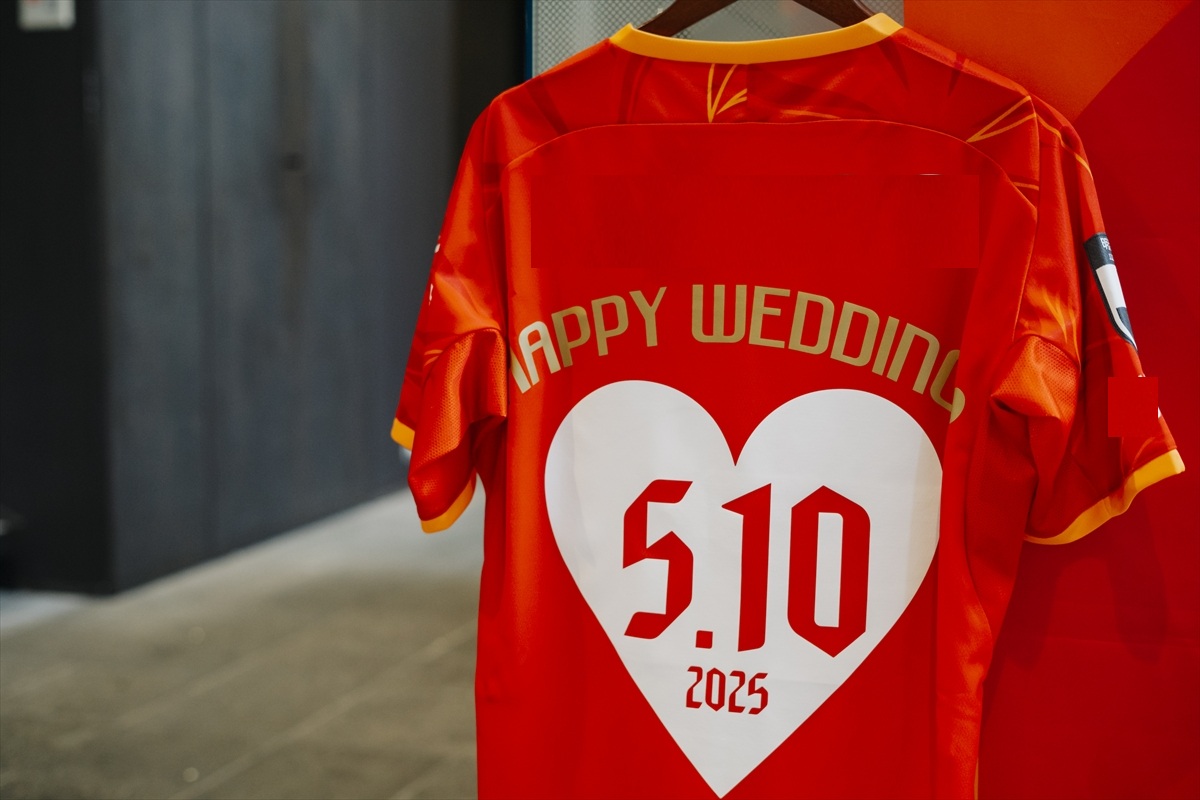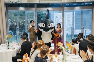 いよいよパーティースタートです。キッチンオープンではたかひろさんよりフランベ演出のサプライズ!グランパスユニフォーム&コック帽を着用して、披露宴会場に登場していただきました♪
