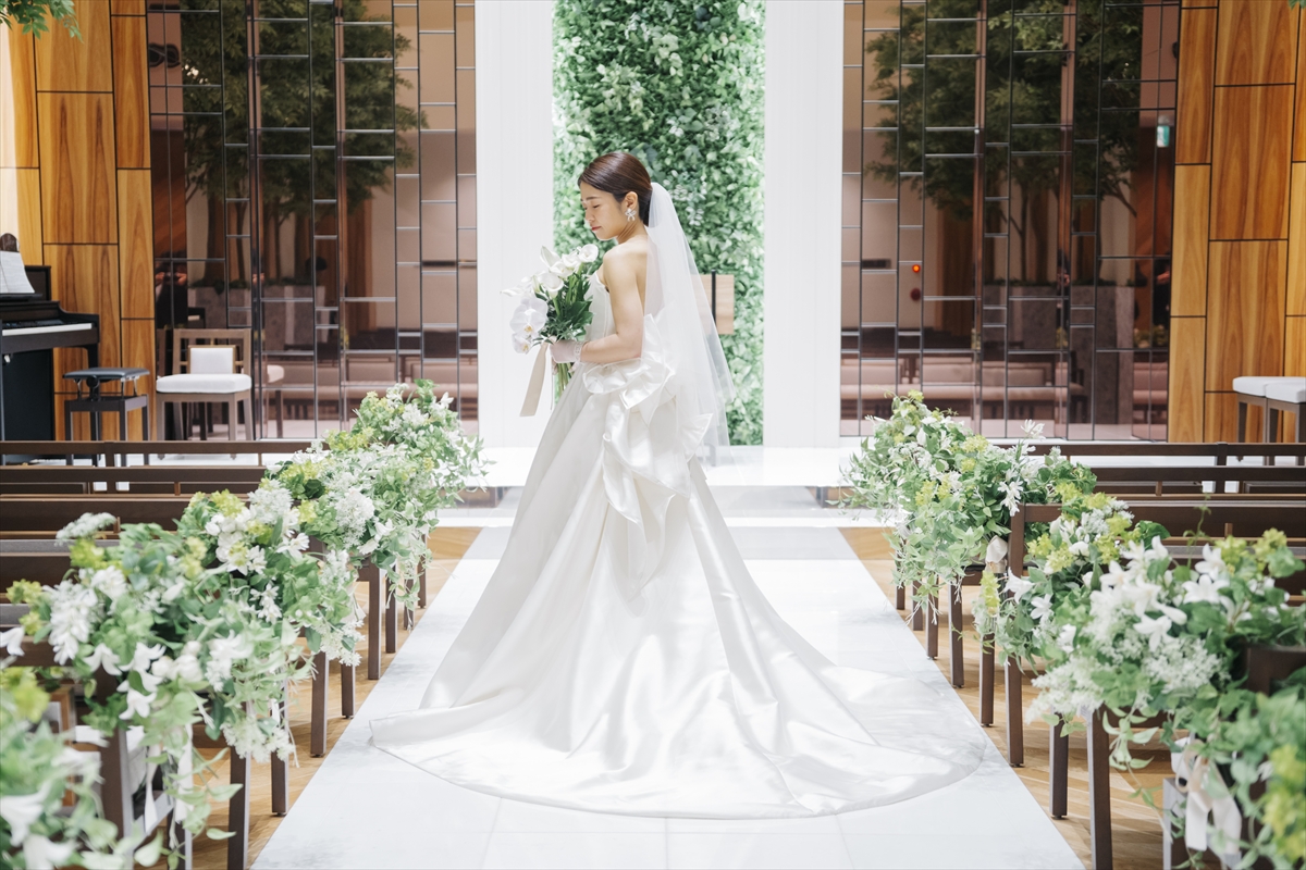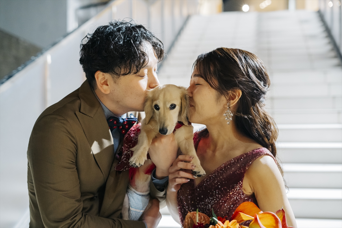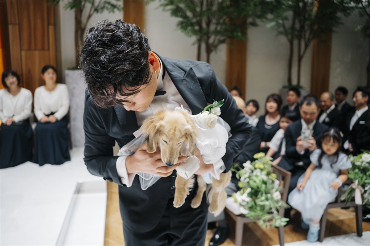 挙式は教会式へと進みます。指輪の交換では、愛犬ダックスフンドのおこげちゃんが大活躍♪会場全体が笑顔で包まれた素敵なお時間となりました。