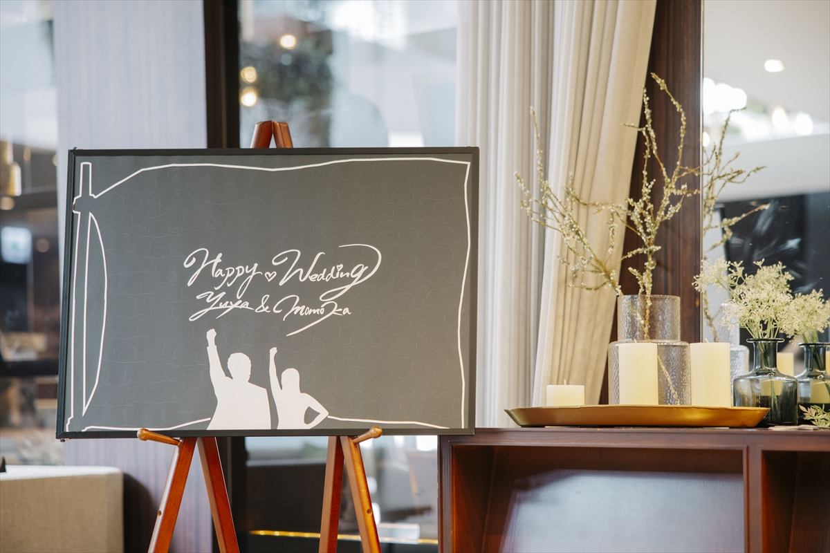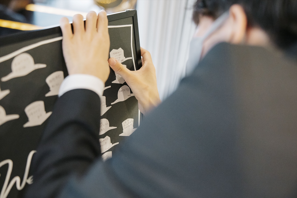 アニメの要素を少しずつ取り入れた、オリジナルの人前式が始まります。結婚証明書は弟様にご協力いただき、アニメの有名なシーンをおふたりに寄せて作成した、旗が描かれているきり絵の証明書をご用意。誓いのキスも、誓いの盃を交わしていただきました!