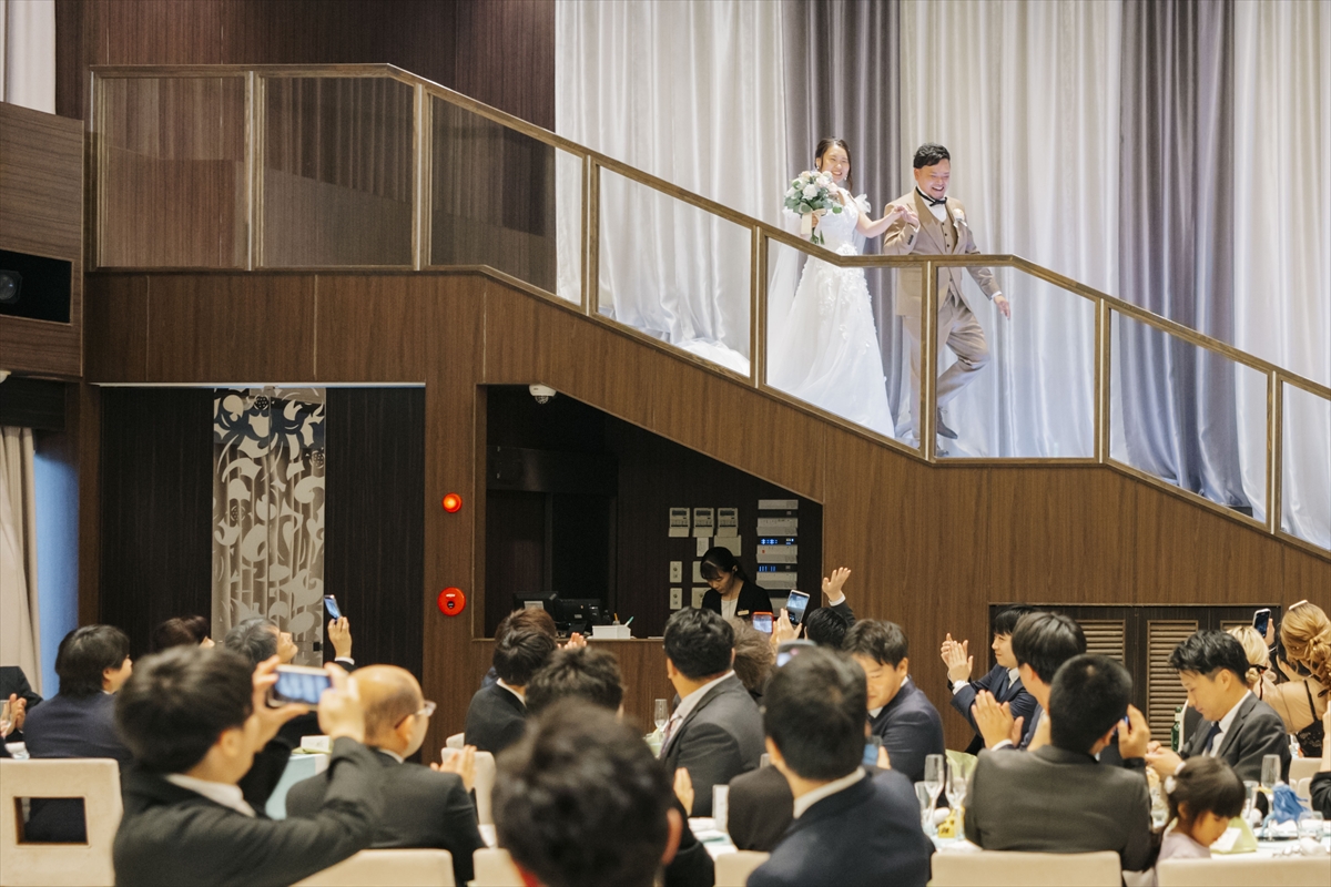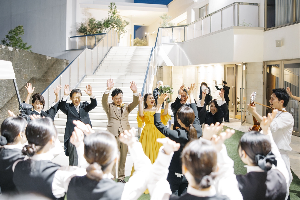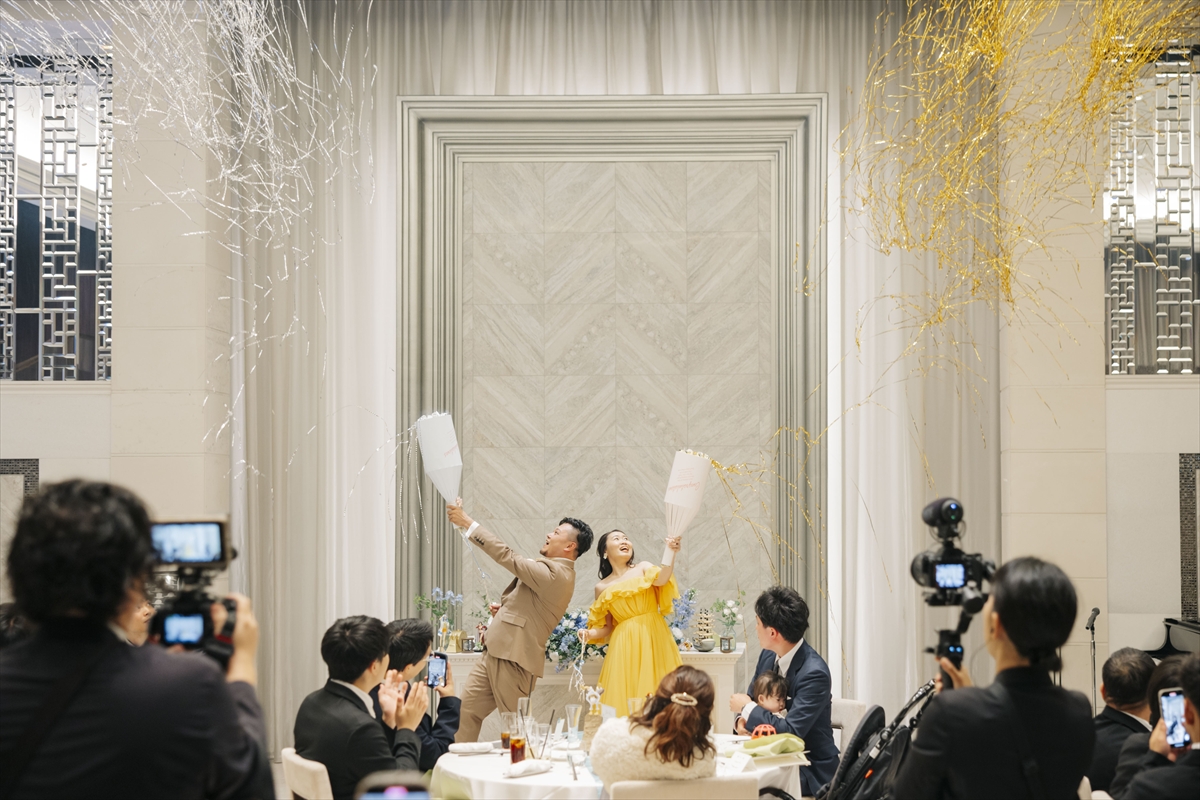 お色直しはテラスから花火が上がるなか、ご登場です!おふたりからのおもてなし【ラーメンビュッフェ】をお楽しみいただき、ゲストの皆さまと一緒に盛り上がる宴のような結婚式は結びとなりました。