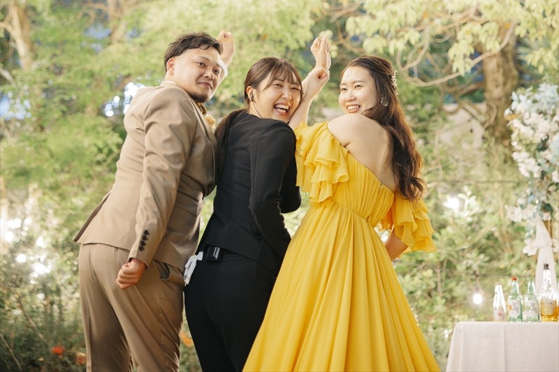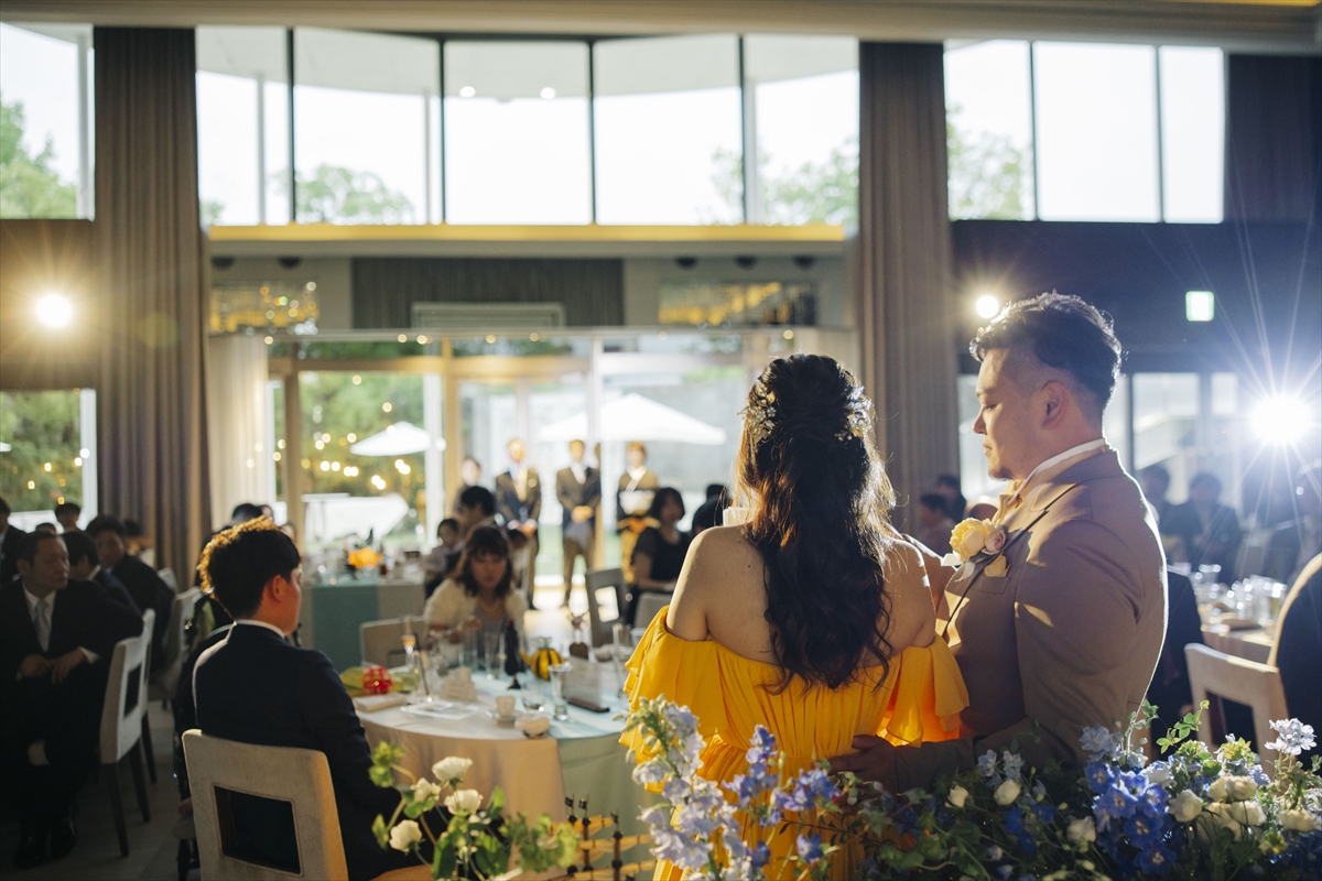 ももかさんが選ばれたのはB.DRESSERオリジナルブランド【meyou】のカラードレス。見た瞬間はっと息を呑むような発色の良いイエローのカラーで、胸元のフリルからスカートまで歩みを進める度に波打つクレープ素材は、気を貼りすぎずエフォートレスにお召しいただけます。